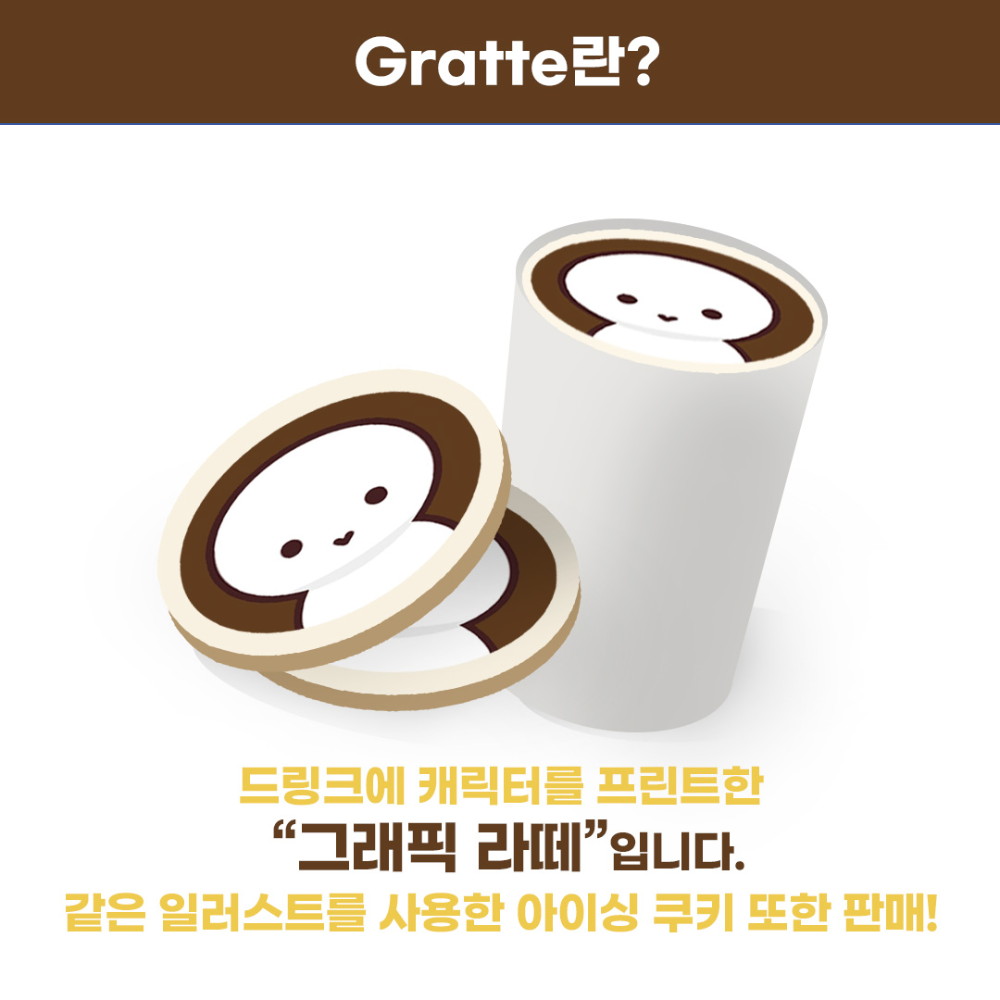 Gratte는 캐릭터를 프린트한 라떼로 동일 도안으로 쿠키도 판매하고 있습니다.
