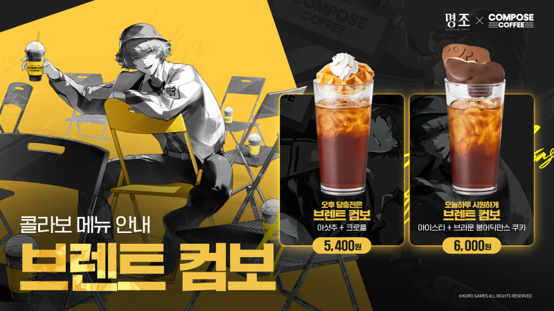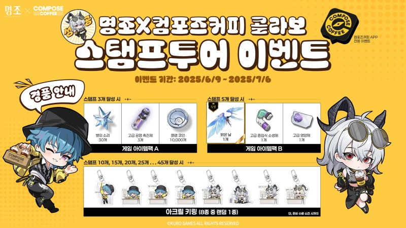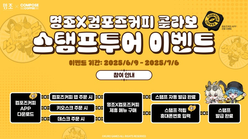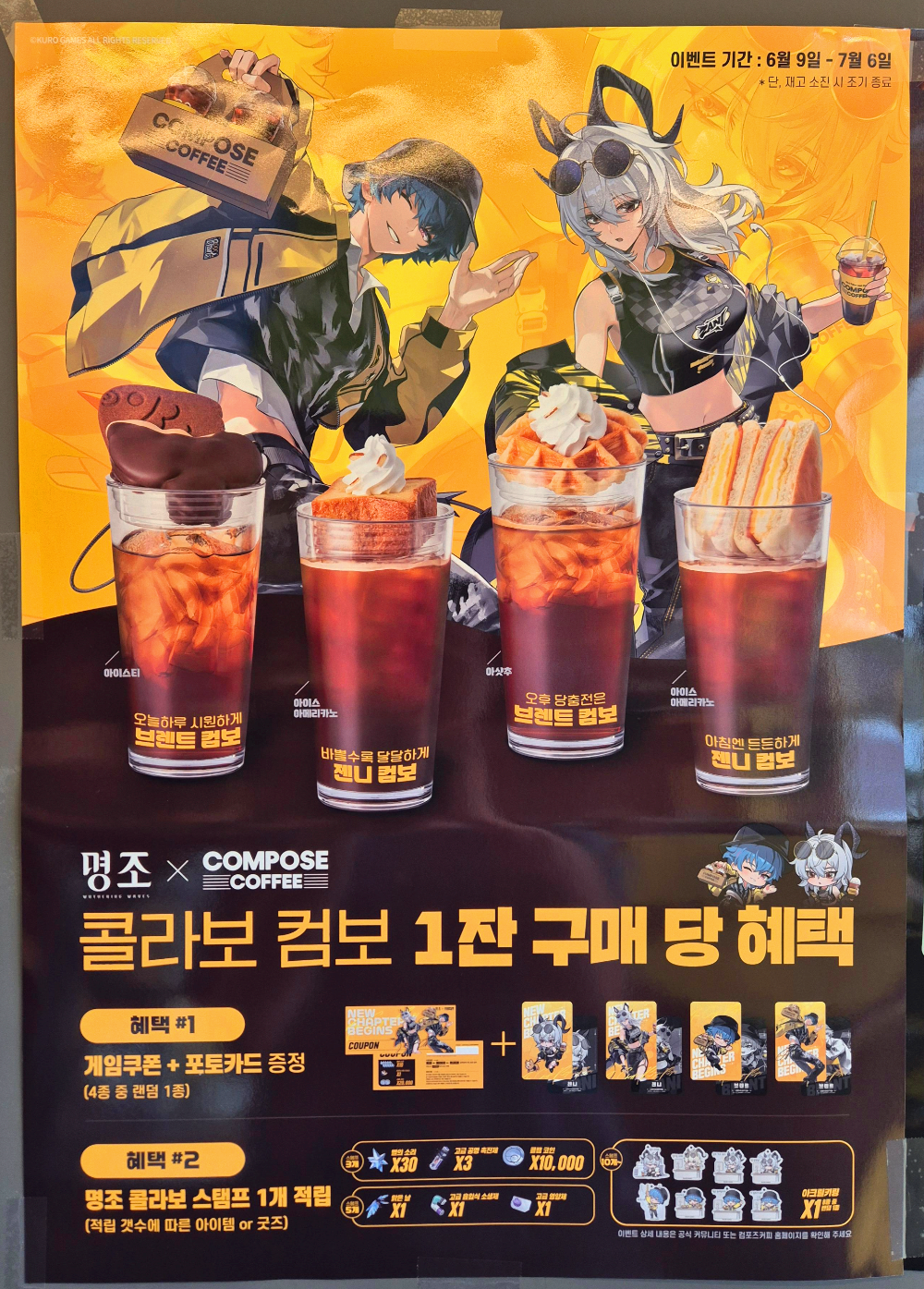 어제인 6월 9일부터 7월 6일까지 컴포즈 커피와 명조 워더링 웨이브가 콜라보를 진행합니다.
