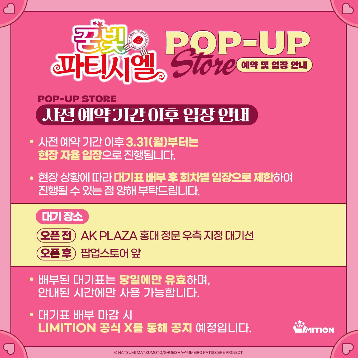 사전 예약이 끝나는 3월 31일부터는 현장 자율 입장이 진행된다고 하는데, 조기 품절될 경우 물건 없이 팝업 스토어만 존재할 수 있으니 참고해주세요ㅠㅠ