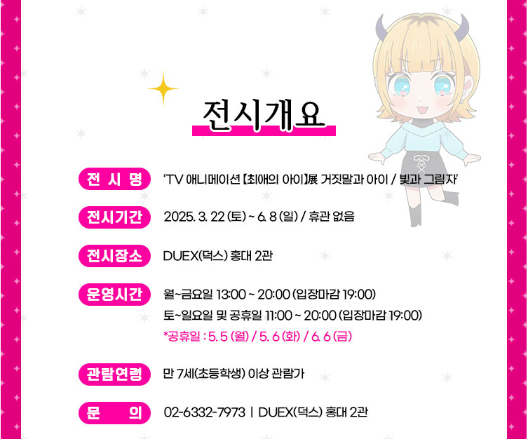 최애의 아이 전시회는 홍대 덕스라는 전시관 2관에서 진행할 예정입니다.