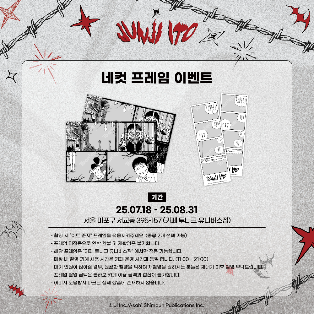 🩸투니크 X 이토 준지✒️ ✨이토 준지 콜라보레이션 카페 OPEN✨ 🗓25.07.18~25.08.31 📌카페 투니크 유니버스점 (합정역 3번 출구 도보 5분)) ✔07/18(금)~07/20(일) 네이버 사전 예약자만 이용 가능 #이