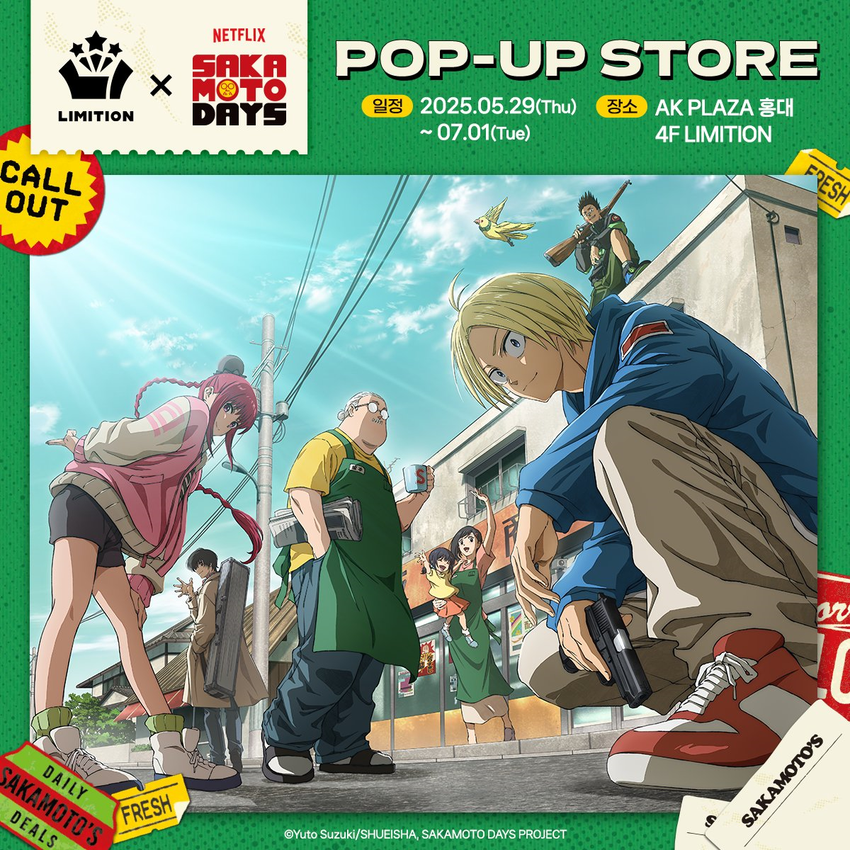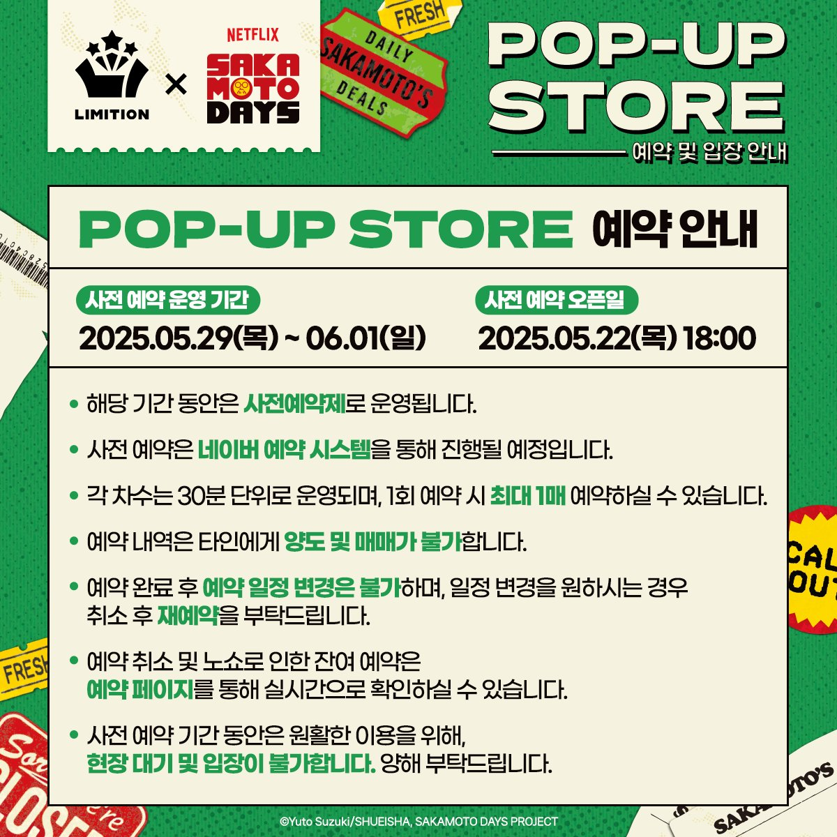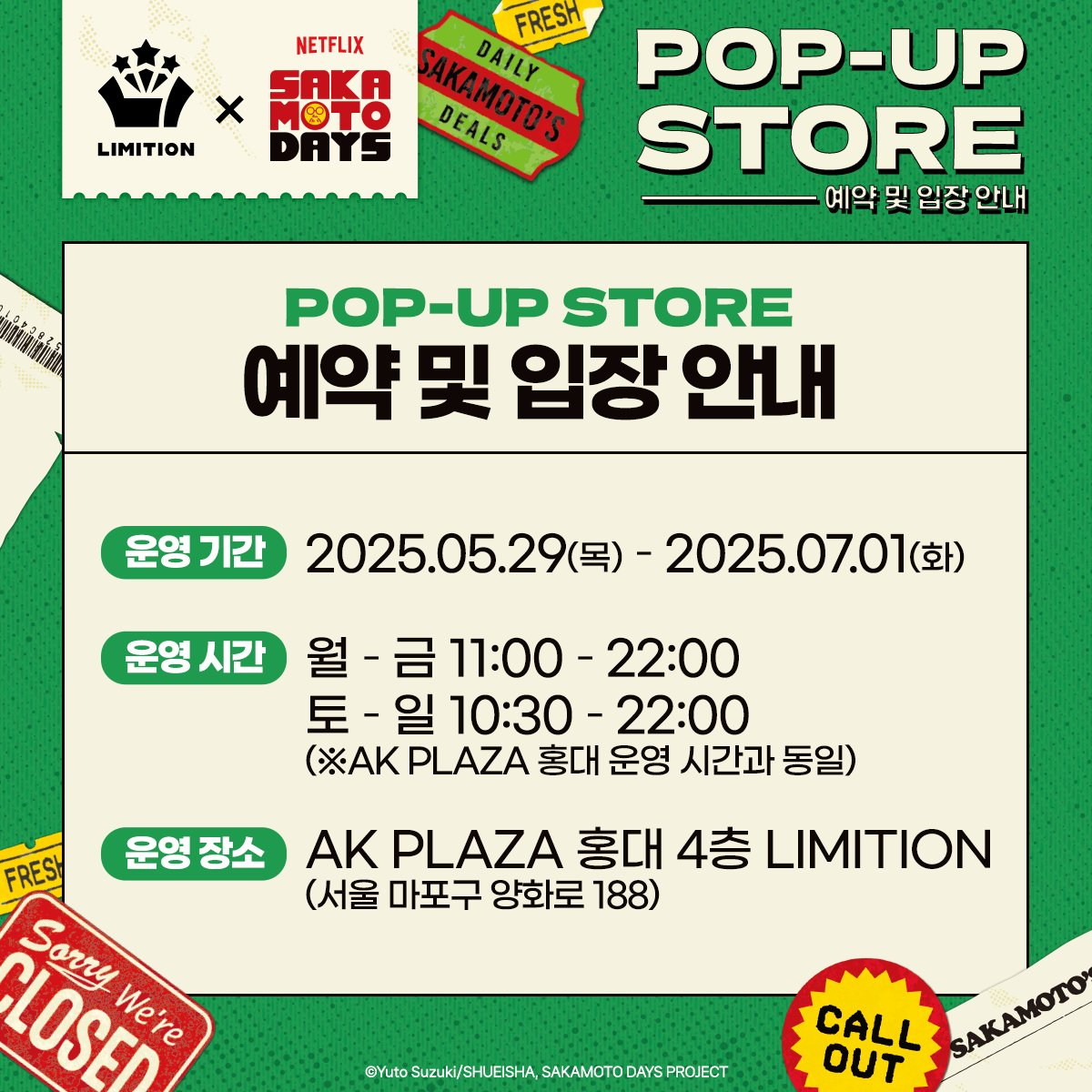 #사카모토데이즈 POP-UP STORE 💥예약 및 입장 안내💥 📍AK PLAZA 홍대 4F LIMITION 🗓️2025.05.29(목) - 07.01(화) 🕗월 - 금 11:00 - 22:00 🕗토 - 일 10:30 - 22:00 🗓️사전 예약 가능 기간: 05.29(목)– 06.01(일)