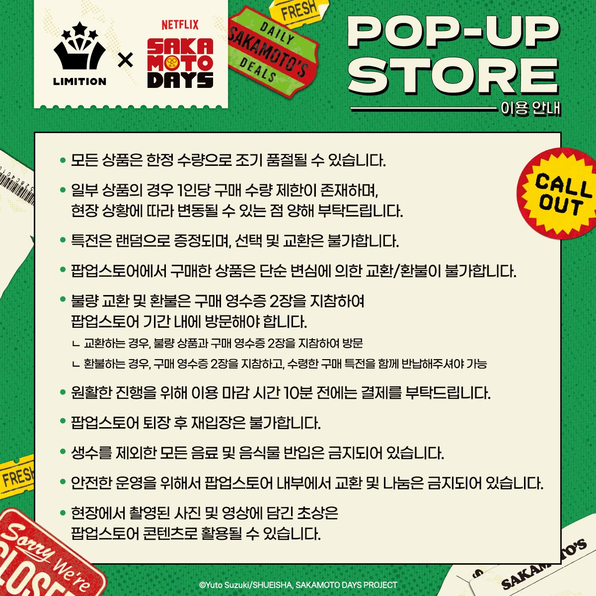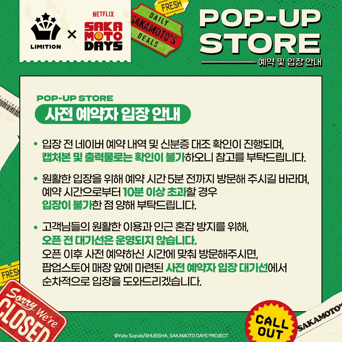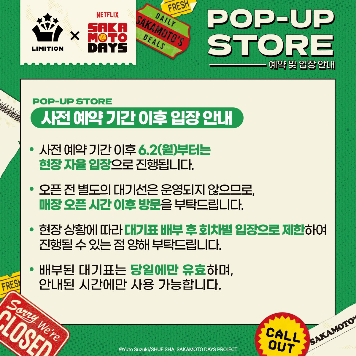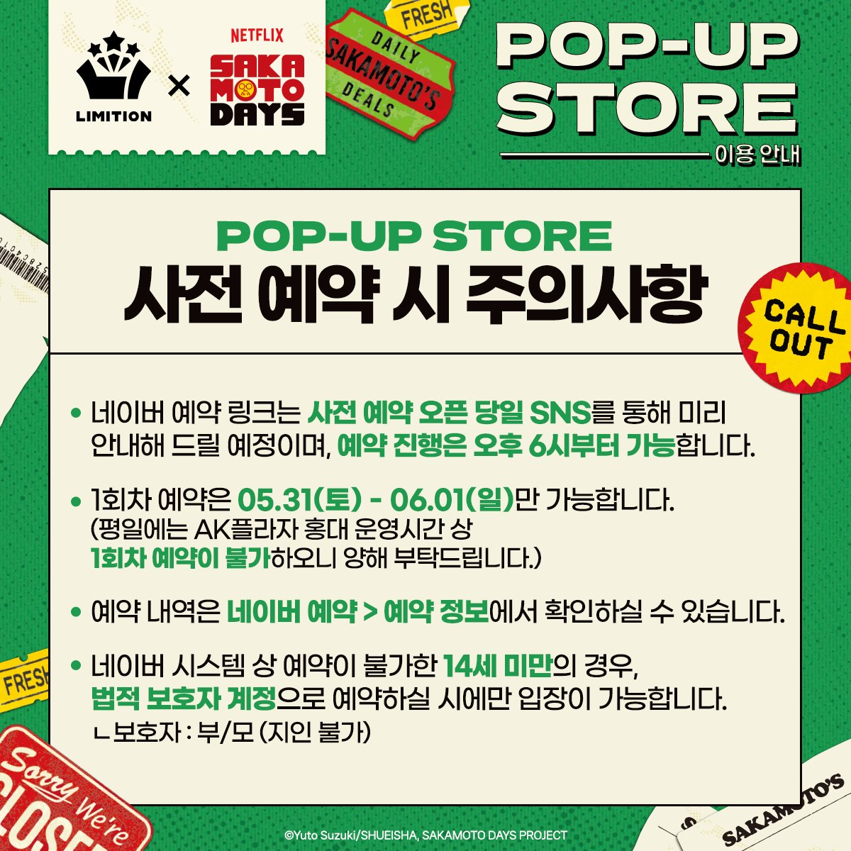 #사카모토데이즈 POP-UP STORE 💥예약 및 입장 안내💥 📍AK PLAZA 홍대 4F LIMITION 🗓️2025.05.29(목) - 07.01(화) 🕗월 - 금 11:00 - 22:00 🕗토 - 일 10:30 - 22:00 🗓️사전 예약 가능 기간: 05.29(목)– 06.01(일)