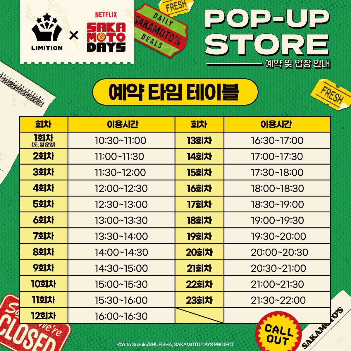 #사카모토데이즈 POP-UP STORE 💥예약 및 입장 안내💥 📍AK PLAZA 홍대 4F LIMITION 🗓️2025.05.29(목) - 07.01(화) 🕗월 - 금 11:00 - 22:00 🕗토 - 일 10:30 - 22:00 🗓️사전 예약 가능 기간: 05.29(목)– 06.01(일)