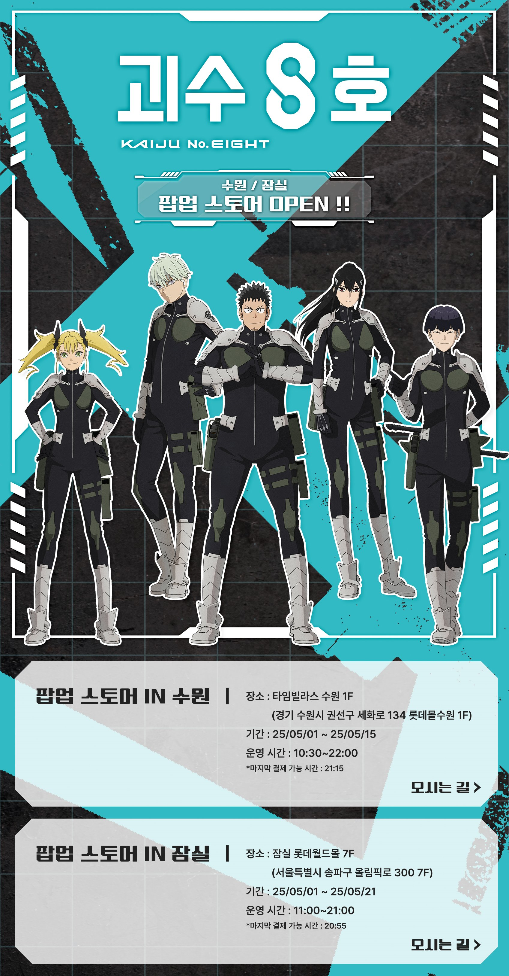 괴수 8호 팝업 스토어는 타임빌라스 수원과 잠실 롯데월드몰 7층 두 군데서 진행합니다!